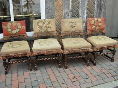 Although upholstery is rare for Jacobean period furniture, dining chairs would have been the ideal choice for upholstery. Please note that the upholstery above is needlepoint showing wear in the seats. The wear does not take away from the value of the chairs and perhaps adds to the value as original.